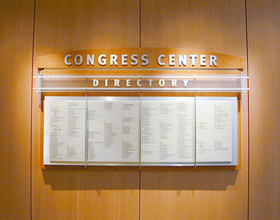 Directories are located in the lobbies of buildings with multiple tenants. They are fabricated with changeable tenant strips that are easy to change and update. They are usually simple in their design, easy to read and can incorporate lighting or dimensional elements.